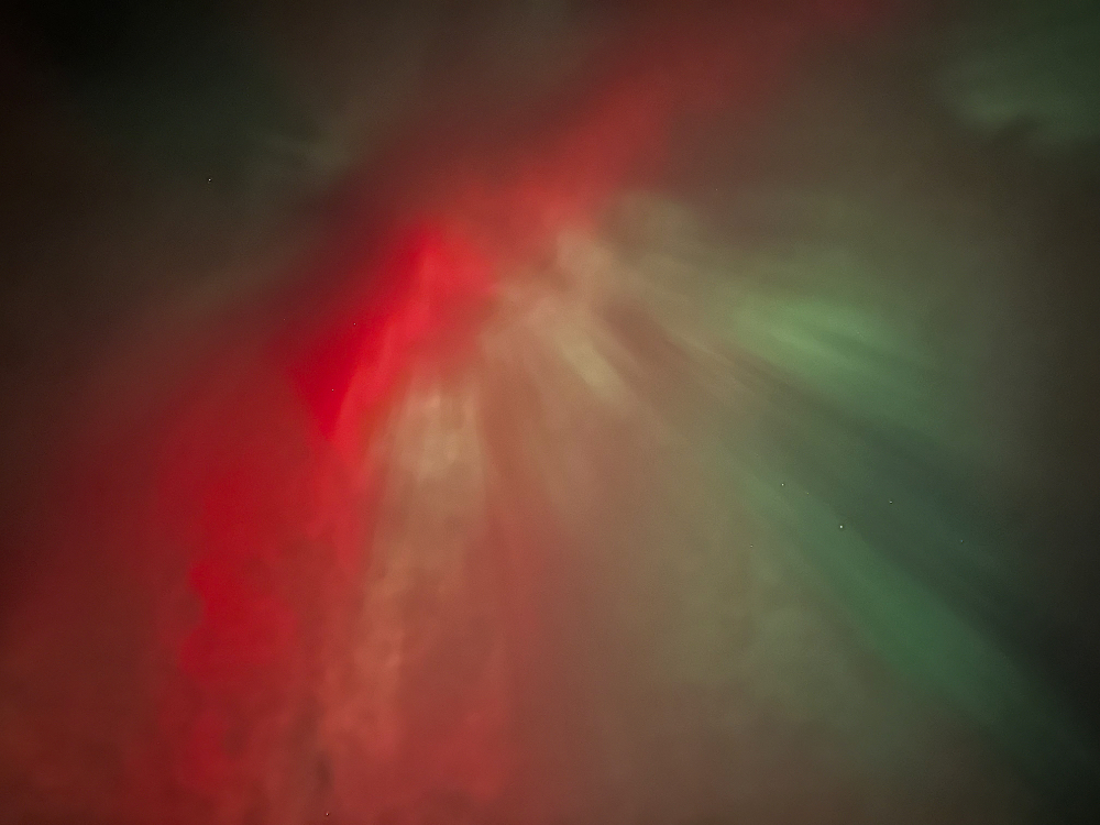 As our typical (early) bedtime approached last night, Cyndie’s phone received multiple alerts from an app monitoring the intensity of the aurora in our location, so we took Asher out for a late walk to check it out. At the high point of our driveway, we lay down to ease the strain on our necks while staring at the sky.
