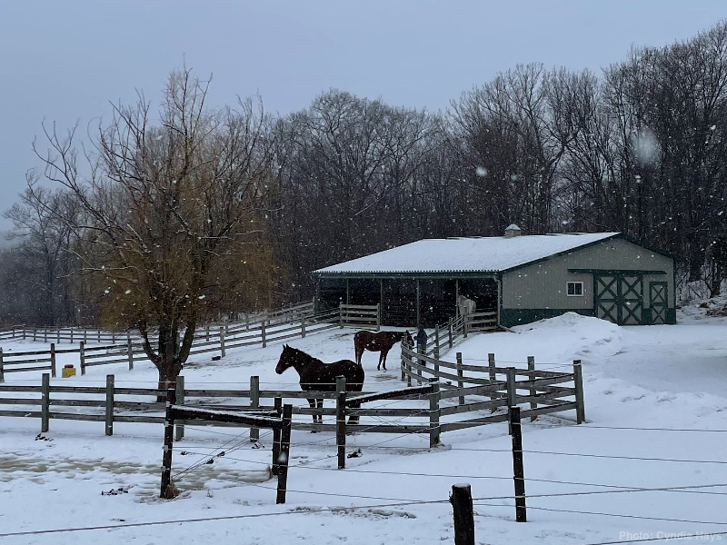 It was refreshing to have Judy’s company on my noon trip to feed the horses where she tolerated extra time out in the elements while I made a few trips back and forth to the hay shed to restock the barn stash of bales.