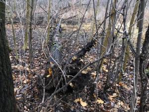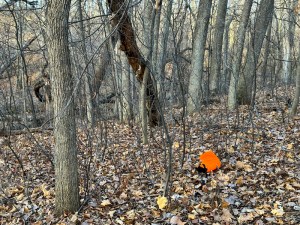 Eventually, enough days passed that I decided to deal with my trending obsession fascination with the blaze-orange object by taking the risk of walking into the neighbor’s woods to see what it was.