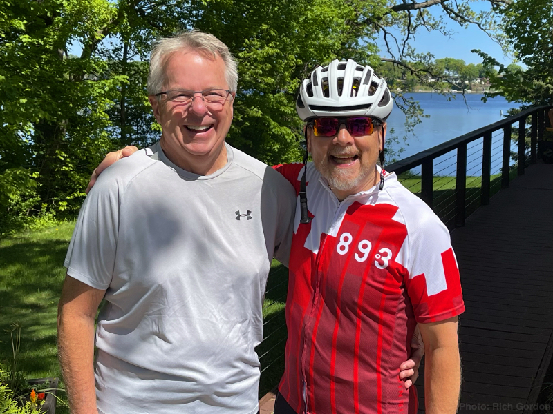 Our route along the Dakota Rail Regional Trail took us right past the home of my good friends, Mike and Barb Wilkus, so I brought a bunch of the riders off the trail to say hi to Mike.
