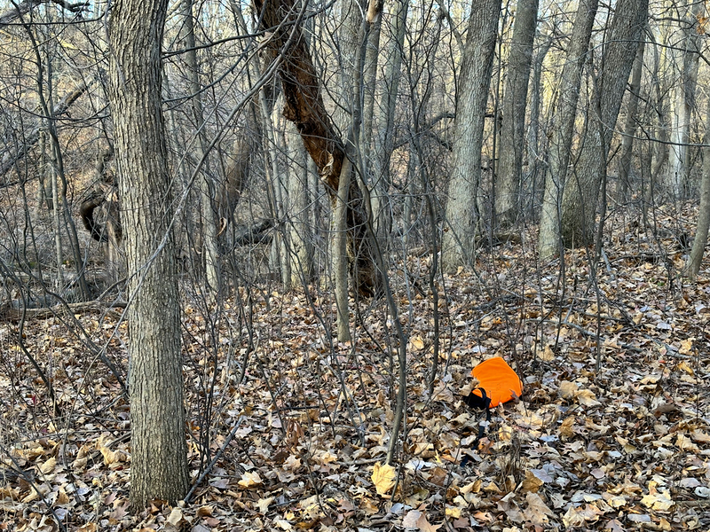 When a glimpse of blaze orange appeared from our front yard about 45 meters (50 yards) into the woods to our north, Asher and I both took notice. Asher wanted to freeze and stare while I preferred acting nonchalant and continuing as if oblivious.