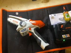 Working on the second tree yesterday using our cool Stihl mini chainsaw, I was cutting so many limbs, one after another, the machine shut down because it got too hot.