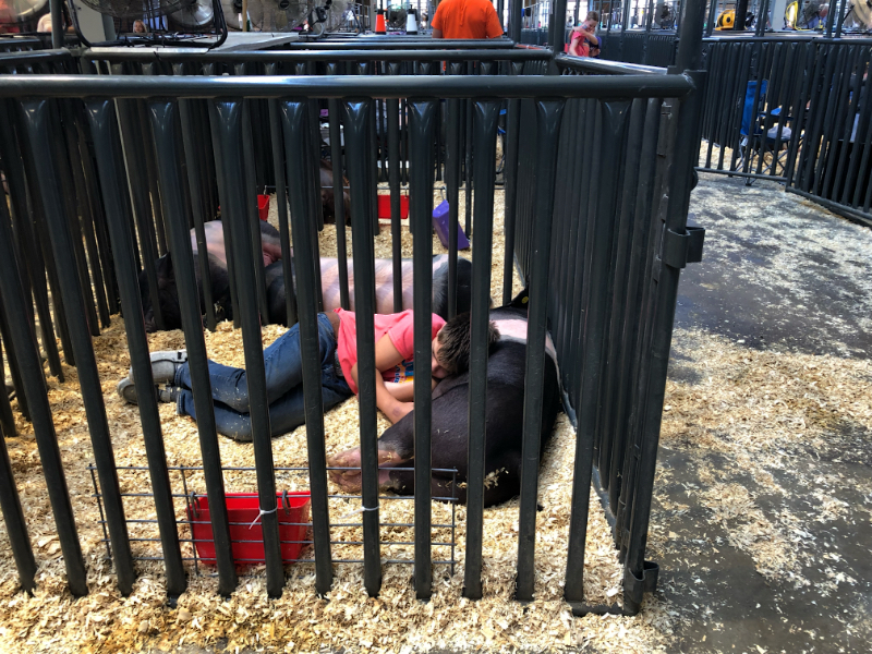 We never did find the 4-H kid who was showing a cow that spent much of the summer on the field next door to us, but we did get to see some kids who really love their livestock. The young man in the photo above was taking a little rest with his prized porker.