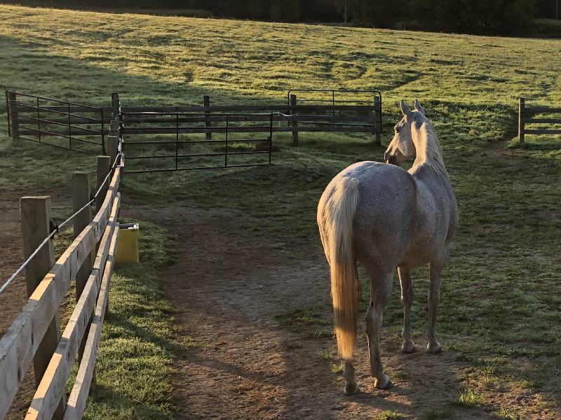 While discussing the horses last night with Cyndie, we jointly came to the recognition that Light’s clinginess to Swings could be a reflection of an insecurity, not a desire to lead. Although we don’t know exactly how she ended up in the kill pen, it occurred to us that she might never be sure that it won’t happen again somehow.