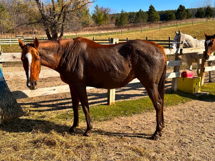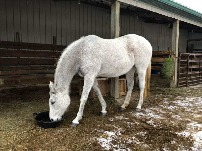 Mix’s full Thoroughbred racing name is “Pleasant Mix.” She was born in Ontario and started racing at age three. Over her three years of running she earned $213,420. We were told all four of the horses became broodmares after they were retired from racing, but we don’t have any of those details. Mix is currently 17-years-old. That is approximately 53 in human years. She is the youngest of the four now living with us.