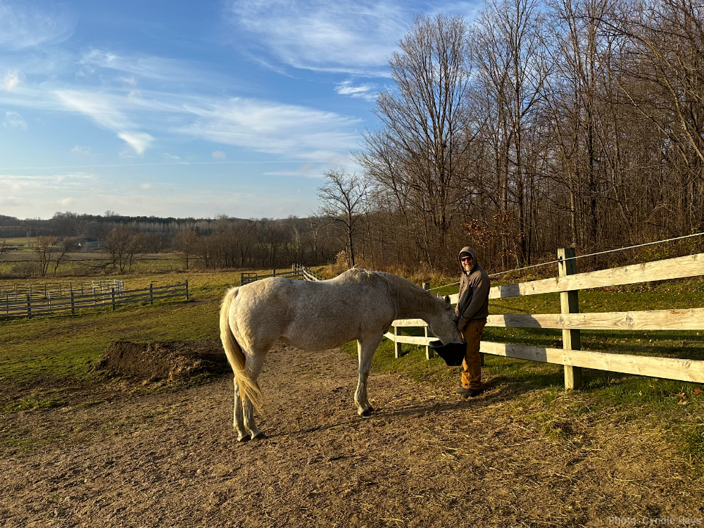 I asked where Swings was this whole time. Cyndie said Swings has been hanging out with Mia, which she doesn’t usually do because Swings doesn’t like Mia. They were grazing grass together and showed little interest in coming up to eat grains.