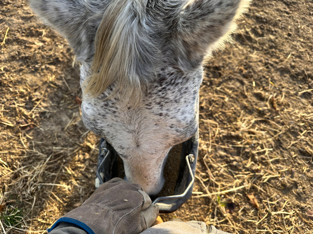 This lasted maybe a minute before I moved on to something else. The four horses were finishing the last of the pellets in their feed pans and basically chilling. Maybe moseying down to get a drink or nuzzle a hay net with half interest. I came out to tie up one of the last hay bags. Mix approached and nosed the bag, then lifted her head to inhale the scent of my breath. I tossed the bag over the fence and was tying it to the top board, losing sight of Mix as she moved behind me.