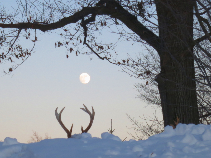 Yesterday afternoon, we were out walking and I decided to find the skeleton of the buck that was in our woods. I wanted to retrieve the head with antlers before any critters got around to nibbling on the antlers. As I was walking back up the hill toward the house, I spotted the moon rising in the east. I set down the deer head and stepped back to see if I could get my little camera to focus on the moon in the distance. It looked captivating to the naked eye, but I was skeptical that I could capture the view I was seeing.