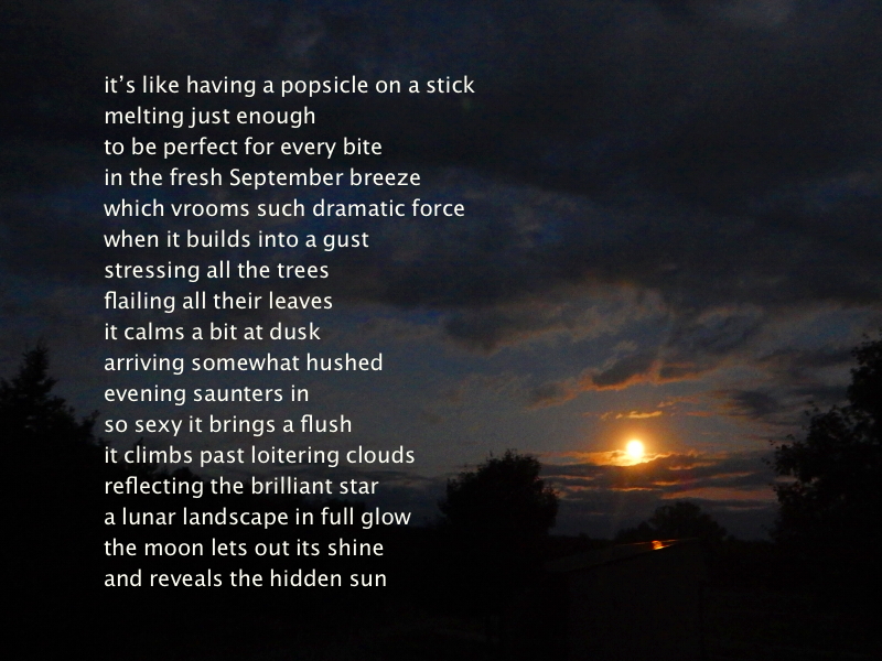 We had some fine-looking moonlight glowing through the clouds last night after the hour-earlier sunset had transpired.