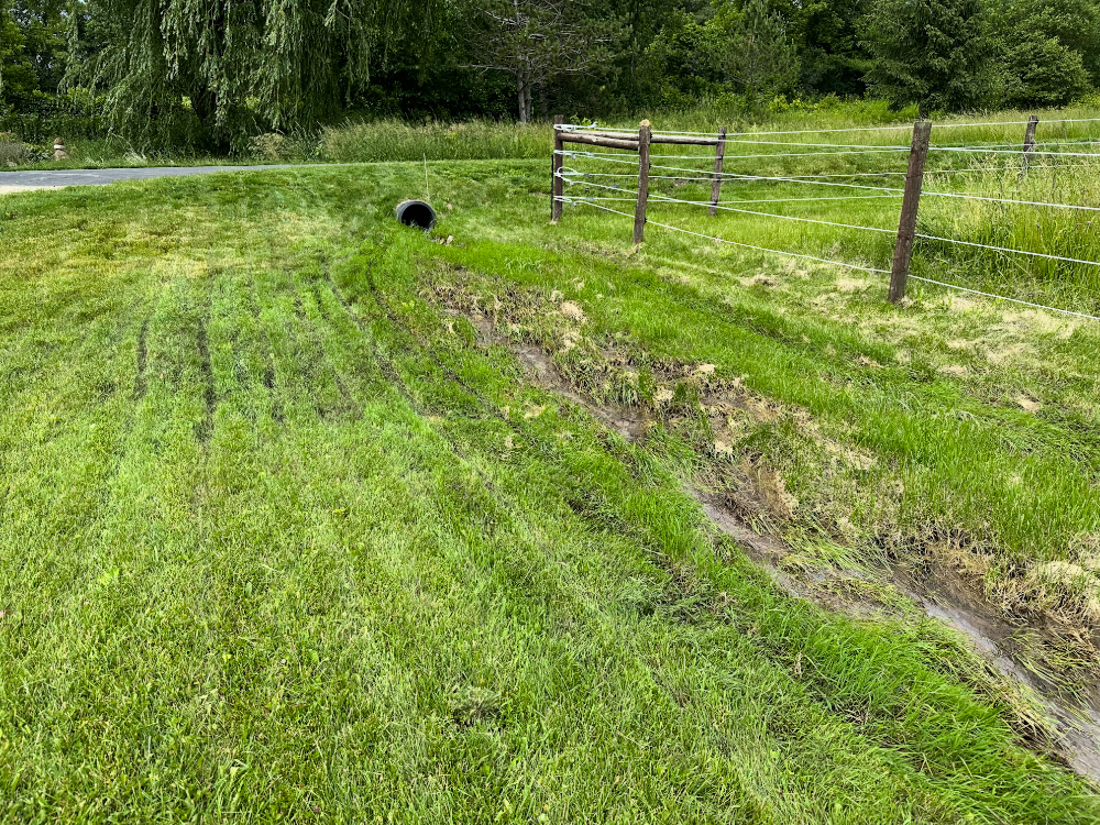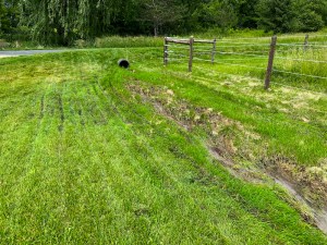 Every spring, I try to shape the ground to guide snowmelt or rain runoff away from the paddock gates. Every spring, that effort ultimately fails.