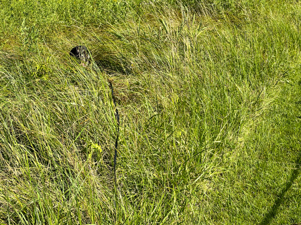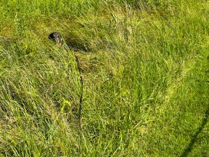 That meant Asher needed to entertain himself in the house. He seemed satisfied with that after hanging out with me earlier in the day while I trimmed along the north loop trail. Asher nestled in the tall grass so that it looked like he was hiding.