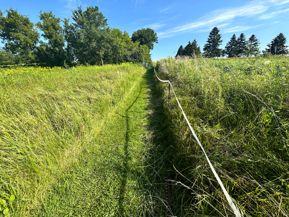 By switching to the push mower and its fully charged batteries, I mowed the labyrinth while the riding mower’s batteries charged. Just over an hour later, I was back on the riding mower and cutting down by the road. As the shadows were getting longer, I finished along the driveway and was ready to call it done. I don’t know how I suddenly remembered those two passes I’d skipped earlier but I realized it just in time to wheel over to the back of the barn and reach the completion of a big day of mowing.