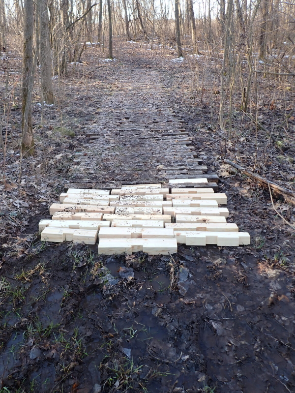 Yesterday, in effort to clean up some of the mud-saster around here, Delilah and I –well, mostly me, she just sat nearby and stared toward the chickens in the woods– dismantled six pallets to reclaim enough lumber for extending the boardwalk on one of our trails by about seven rows.