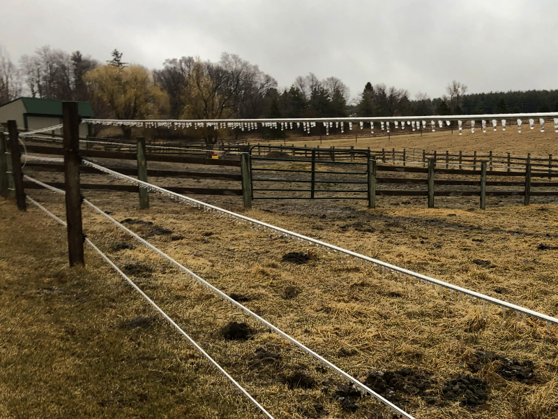 In the last two days, we have received periods of heavy rain, including some lightning and thunder, followed by moments of sleet and slushy snow. The temperature has been hovering at the freezing point, and the water dripping off the fence wires was beginning to form cute little icicles.