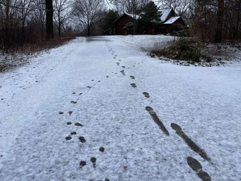 I found skid marks in the big paddock that revealed one of the horses slid on all four hooves for a length of about four feet. I assume one of them had started to bolt and then tried to slam on the brakes. Thank goodness they all looked fine when we arrived to serve their evening feed.