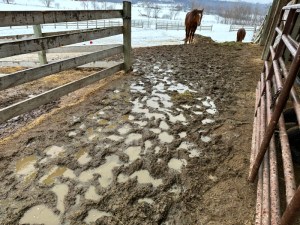 Last week we received some solid rain at an even rate for many hours at a time that was more than we’ve seen for months. The limestone screenings just beyond the overhang turned into a mare-urine enhanced stinky slurry of muddy, slippery limestone mush.