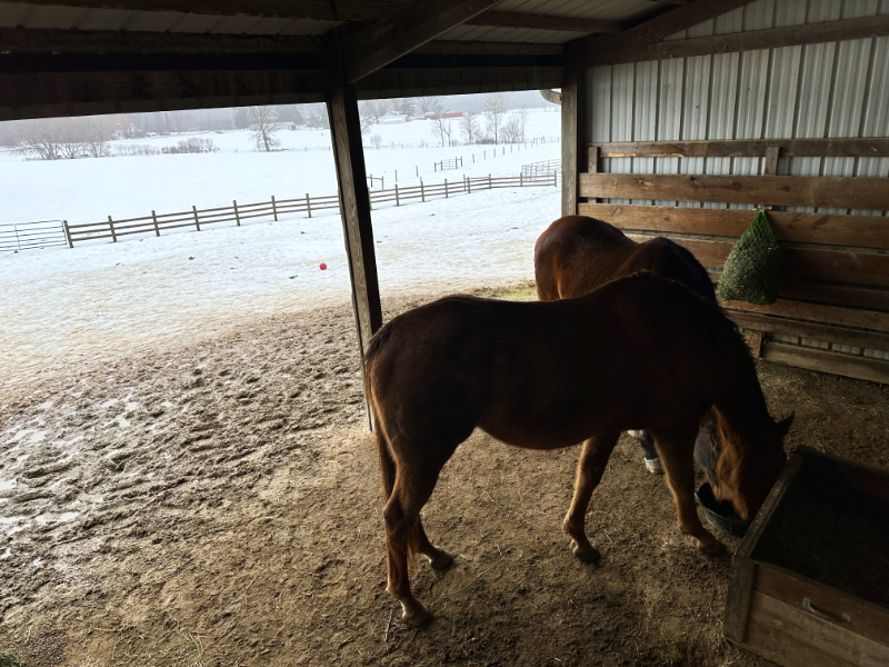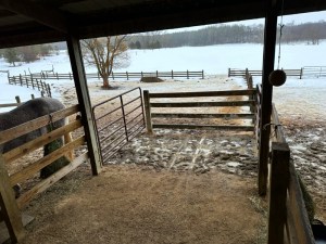 The long day of drizzling rain was beginning to become sleet blown sideways by gusty winds when I went down to feed the horses at dinnertime. Beneath the overhang, it was calm and dry. Once again, I found myself praising the location and orientation of this barn.