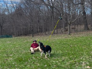 He is proving to be a good on-leash walker and only chewed through the leash one time while Cyndie was distracted with digging up invasive garlic mustard plants. He played well on the zip line in the backyard and rolled around in smelly leaves on one of our walks.