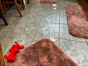 Our darling puppy was up to mischief while I was showering yesterday. When I opened the curtain I discovered a trail of evidence strewn across the floor. Somebody was nosing around in a waste basket where they weren’t supposed to be. Who would do such a thing?