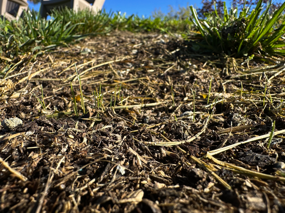 September is a great month for planting grass seed. Yesterday, with the high temperature reaching 86°F, the baby grass blades sprouting in the area where Cyndie had scattered seeds needed a big drink of water.