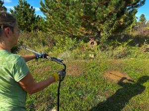 I pulled out the ATV and hooked up the trailer with our water tank and sprayer. I don’t think we’ve used this watering system in a year. The battery that drives the pump was still good, but the spray mechanism sure wasn’t.
