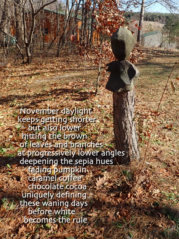 When you woke up today, did you realize it was the last day of November? Our weather took a step back toward October yesterday. That served to complicate my assessment of what day and in which month we find ourselves at the moment. Of course, that confusion rides on top of the daily challenge one experiences when living in retirement and not having anywhere one is required to be on any particular day.