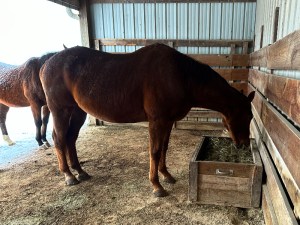 Yesterday’s pleasant weather made it comfortable for the farrier to trim the horse’s hooves. The horses were relaxed when I showed up to put on their halters but by the time the trimming got underway, it was precariously close to their usual feeding hour. With each passing minute, they showed an increasing impatience for feed pans to be delivered and a decreasing interest in standing around calmly for trimming.