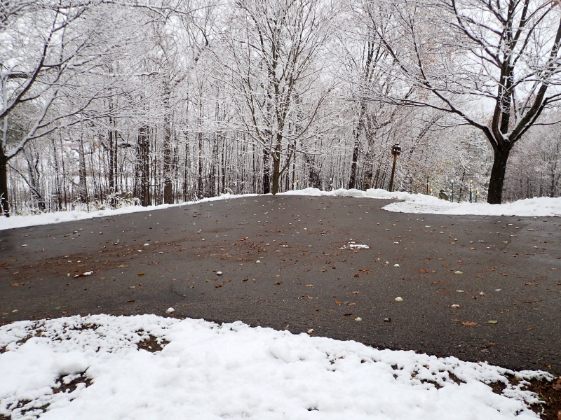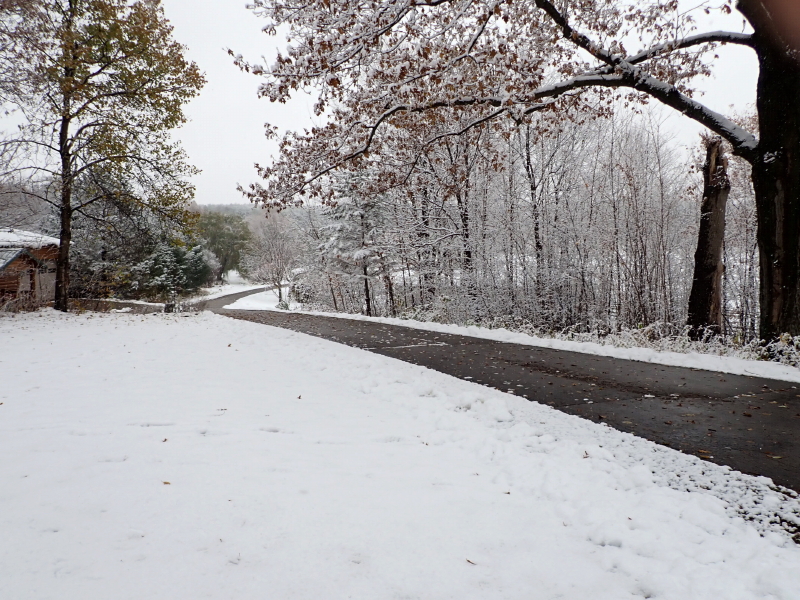 If we have to endure so much snow in October, at least we benefited yesterday from a temperature that was the perfect balance for gorgeous falling snow without the need to plow or shovel. The ground isn’t frozen yet and the rate of falling flakes was not high enough to overwhelm the residual warmth in the asphalt of our driveway.
