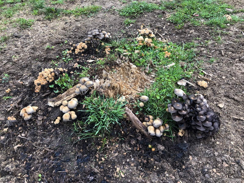 If any of those mushrooms are edible, I don’t think they interest the horses. Our horses chew wood, but not so much the squishy fungi that feed on wood.