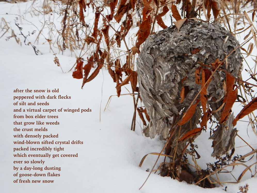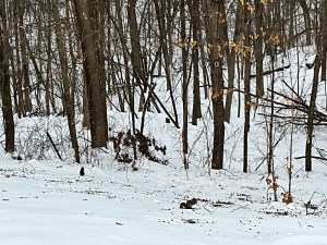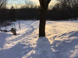 Our snow is getting to be old snow and is filled with a clear chronicle of animal activity since the last significant accumulation. It’s great being able to see everywhere the horses have been in the two fields we almost always have open for them. They are still finding grasses to munch on underneath the snow out there.