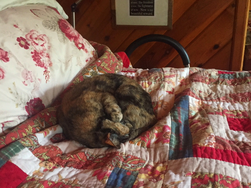 Pequenita, who generally reserves the majority of her affection for me, has switched allegiance and has been sleeping on Cyndie the last few nights. I spotted her on Sunday, all curled up in a ball with her head turned over, sleeping just below Cyndie’s pillow.