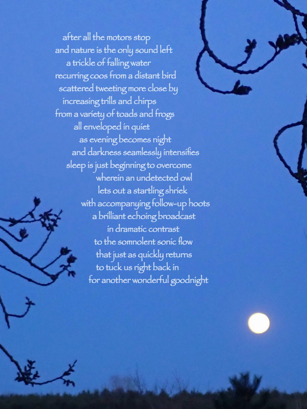She said she heard it, too. She then told me she’d recently read up on the sounds the raccoons have been making, and it said that sometimes a raccoon can sound like an owl screech when mating. That would have spoiled it for me, except we both agreed the sound we heard was not a screech at all. It was definitely a perfect, pleasant hoot, and we’re going to go with it having been an owl.