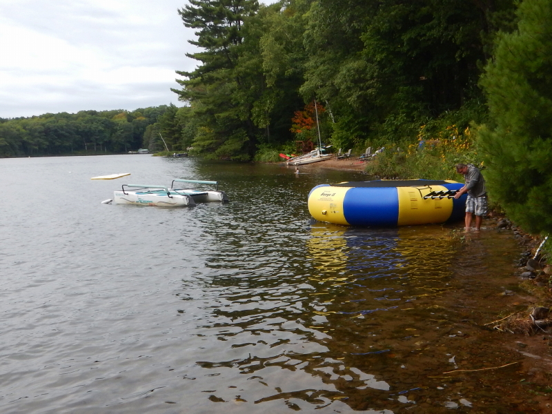We set up a station for cleaning and deflating, and each large floating toy was detached from its anchor and brought into shore. Many hands made for small work and we washed, dried, deflated, and rolled up the big trampolines for winter storage in the garage with impressive efficiency.