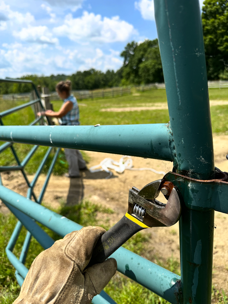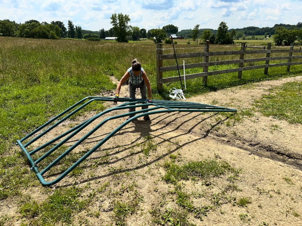 It doesn’t look pretty and it’s not very sturdy, given several kinks and broken welds, but it closes the space and serves as a visual barrier at the very least. I’m rather pleased we aren’t forced to buy a new one to replace it right away. If a horse decides to run into it again, I suspect the result will be beyond repair.