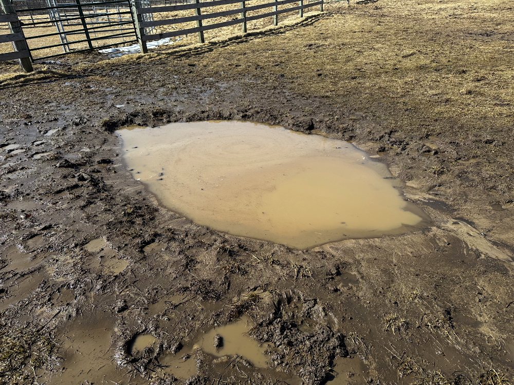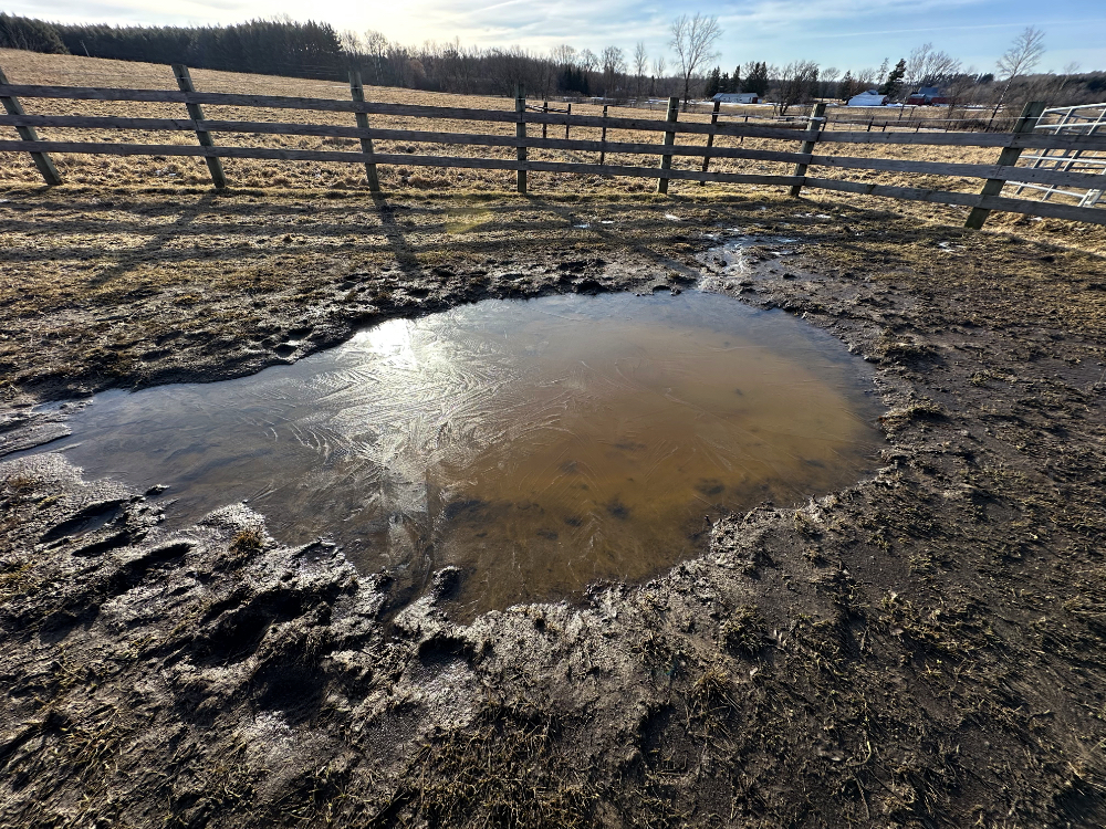 My footprint was a result of retrieving the horses’ Jolly Ball that had rolled into the middle of the muddy remains of the “lake.” It’s always interesting to find the ball has been relocated from the spots where I place it, handle up, in hopes of enticing them to play.