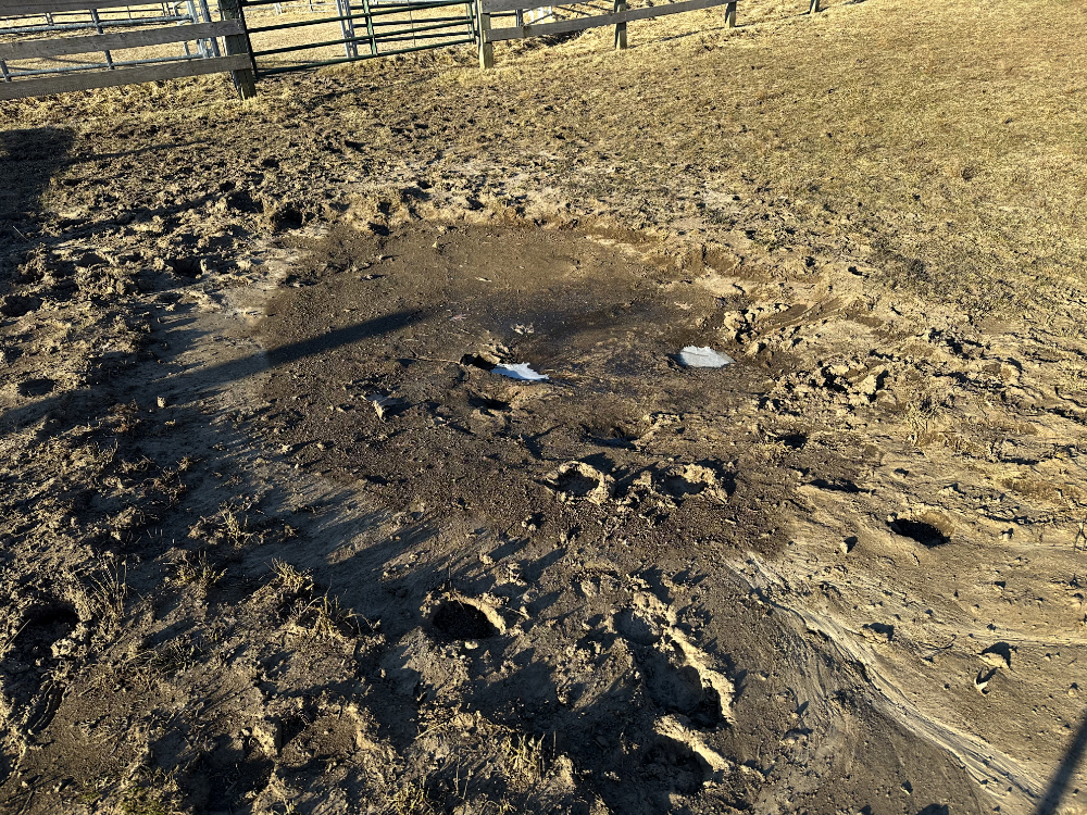 It looked like somebody had laid down there. My second perception involved the possibility it was an unintended lay down as a result of a slip. Yikes. Happily, none of the horses showed any sign of injury.