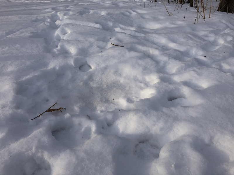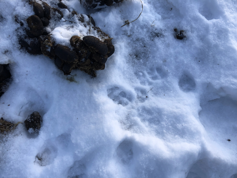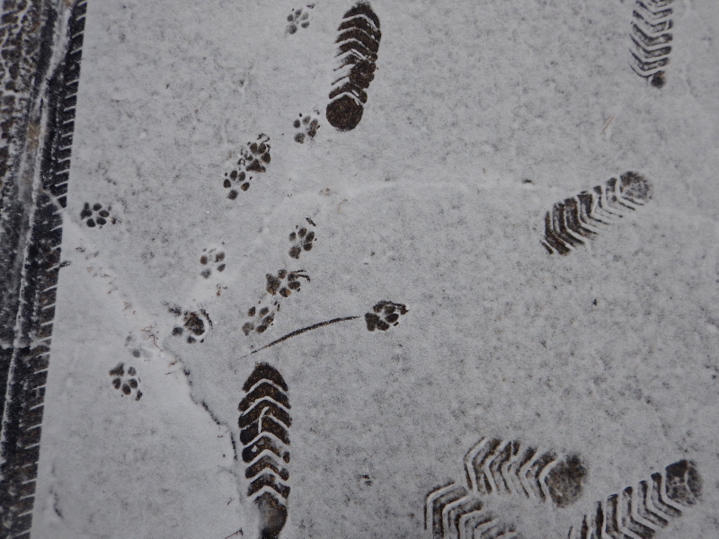 As a result of the fraction of an inch of snow coating surfaces outside, we get new opportunities each morning to see where all the nocturnal visitors have tread around our grounds. The other day, I found some decent-sized canine prints on Paddock Lake that could easily have been a coyote passing through.