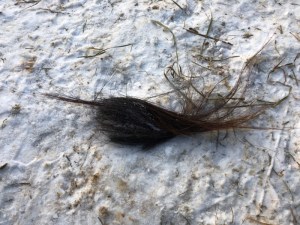There was a large chunk of hair matching the color of Swing’s tail laying in the snow. I immediately got Cyndie’s attention and she reacted with a level of shock that aligned with my concern. Upon finding footprints in the snow by the manure pile, I told Cyndie about Delilah’s behavior just around the corner by the back pasture.