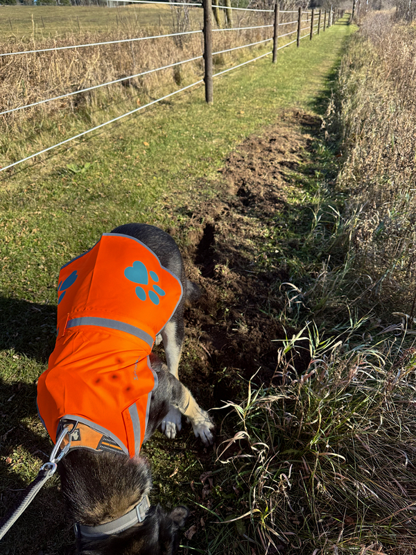 A few days ago I granted him full freedom to dig away on the path around the horse fence where new mole activity recently appeared. He dug with impressive fervor for the longest time which I assumed reflected he was smelling a scent that indicated prey was close at hand, or paw, as it was.