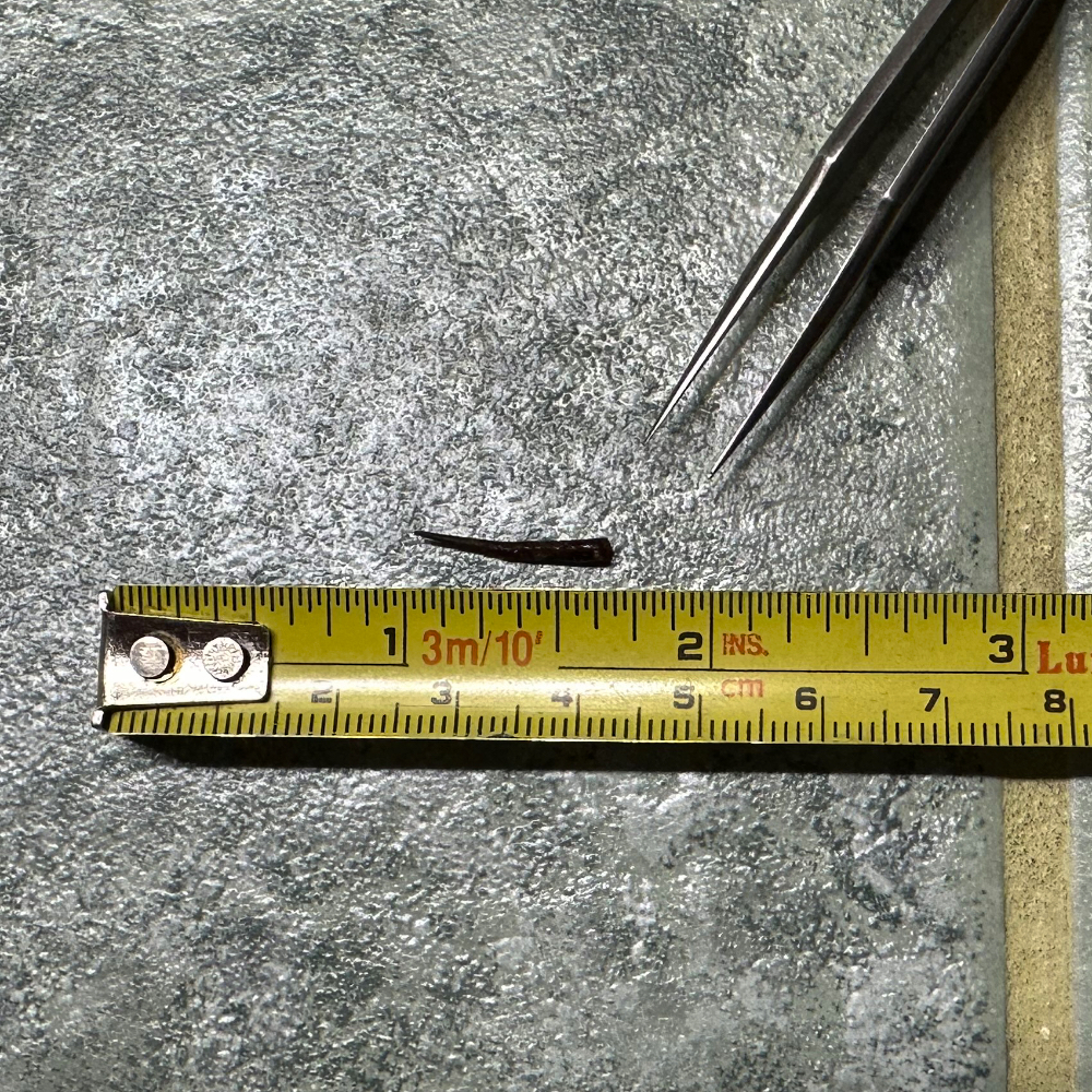 At almost 2 cm long, I could barely believe my eyes as it exited my knee in one long, smooth pull. I’ve been feeling giddy over having it out ever since. It’s kind of funny to me that I had grown indifferent to the purple spot for more than a decade, but now feel so overjoyed to have the cause of that dot extracted. I’m curious as to why my body decided it was finally time to push it to the surface. Maybe it was just so deep it took this long to do.