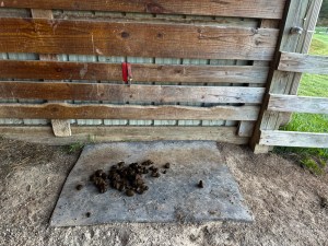 My gut tells me it’s other horses soiling her mat, but I have no idea whether any message is intended. As a general rule, their distribution of manure is pretty random. I have always thought that animals had a natural aversion to pooping where they eat. These horses long ago learned that I pick it all up, no matter where they dump it, so maybe they figure it’s not something they need to concern themselves with.
