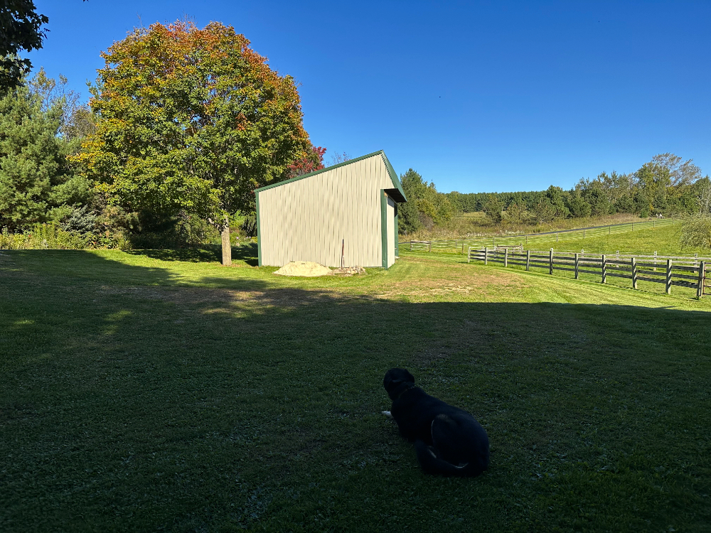 I took a couple of photos yesterday to share that we have a tree showing signs of color in its outer leaves, and Asher was supervising my mowing job. When I looked at them on my computer screen, I noticed something interesting about the way the hay shed looks.