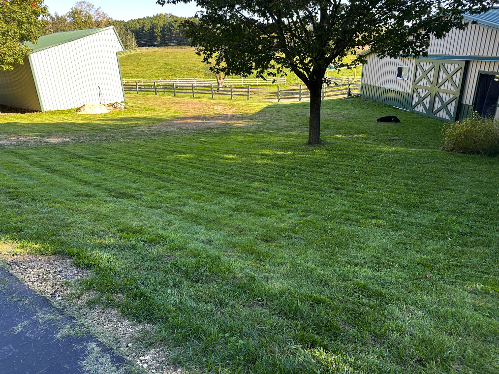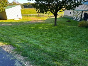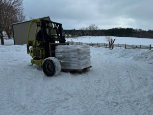 I had tried to plow that circle around the hay shed extra wide in advance of a hay delivery sometime in the near future. I wasn’t thinking of the feed delivery. The last few times, the driver parked on the road and drove his forklift up the driveway. The driver yesterday had never been here before. He decided to back out to the road and bring it up on the forklift.
