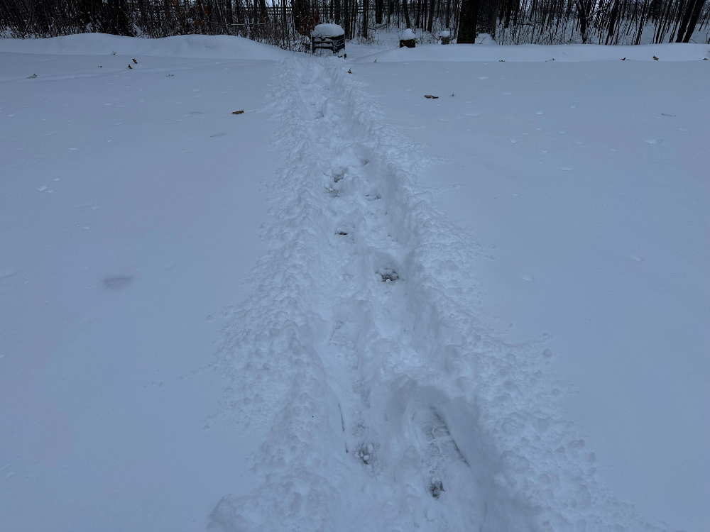 That’s my path through the new snow upon returning from the barn after feeding the horses. After plowing the driveway, I moved to pulling snow off the roof in the two problem spots. While shoveling away the mess that had been created on our front steps, Cyndie texted that we would be receiving feed for the horses in around half an hour.