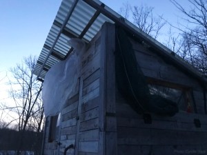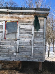 There is open space between the walls and the roof of the chicken coop which allows for maximum ventilation. The “ceiling” of the coop is nothing but an open mesh of quarter-inch hardware cloth that allows moisture to vent out, but during windy winter storms, can also let snowflakes in.