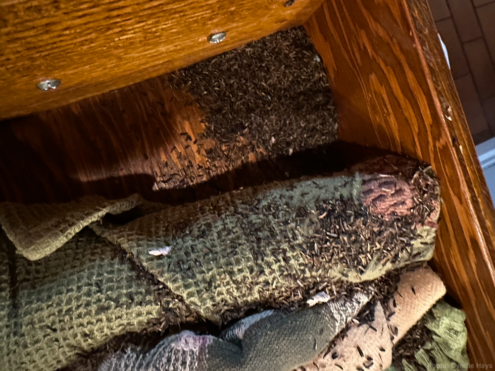 This had to be a couple of lifetimes’ supply for the mice. I wonder how many trips up to the loft it took for the amount of seeds Cyndie found stashed up there. Being a wily sleuth, Cyndie checked a kitchen drawer that has had mouse droppings in the past.