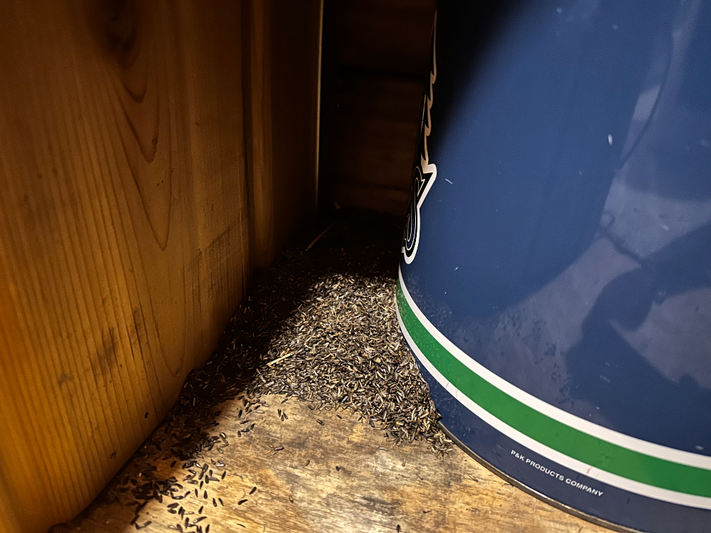 There was too much for it to be mouse turds. Was there a bag of wild rice up in the loft? No, that’s birdseed. Thistle, to be precise. We checked the pantry where birdseed would likely have been stored. Sure enough.