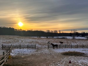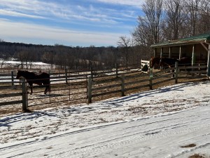 I walked through the small paddock toward the crazy bird, and he took to the air with all sorts of squawking and disappeared across the plowed field north of us. Slowly, the horses made their way in and settled down to eat.