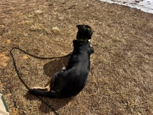 With the warm temperatures, the thawing ground offers all sorts of scents that Asher can’t resist rubbing against. It wasn’t until we got back into the house that it became noticeable, but his coat now has picked up a heady aroma of dusty, dry grass and some wildlife perfume that smells a bit like plastic when it gets too hot.
