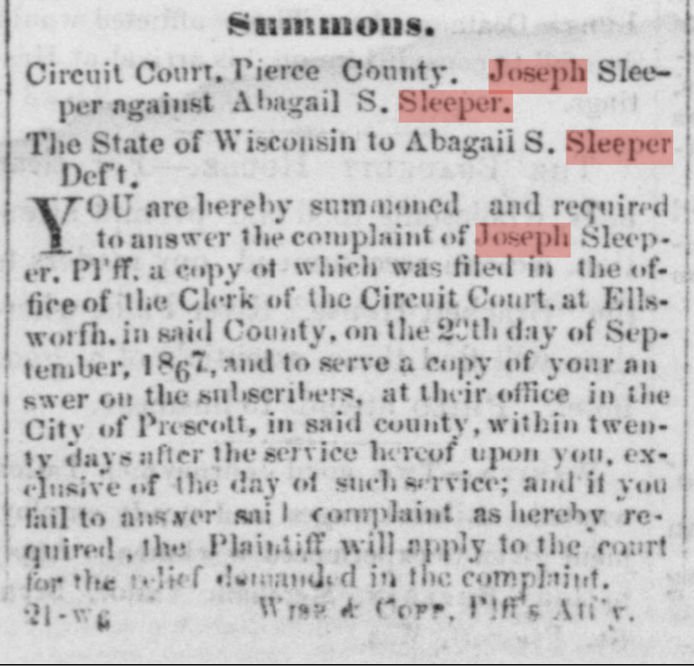 In fact, I discovered there was a summons published in the Prescott Journal about a complaint between Joseph and his wife, Abagail: